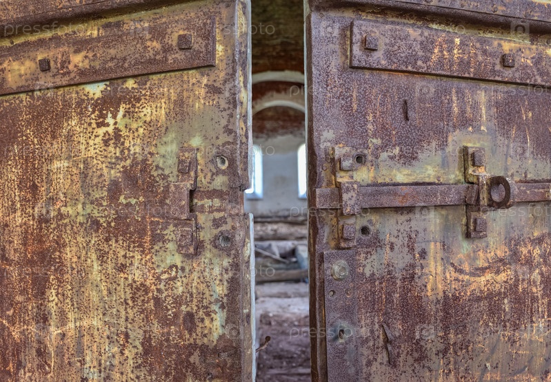 Ржавая металлическая дверь в заброшенной церкви, вход в заброшенный храм