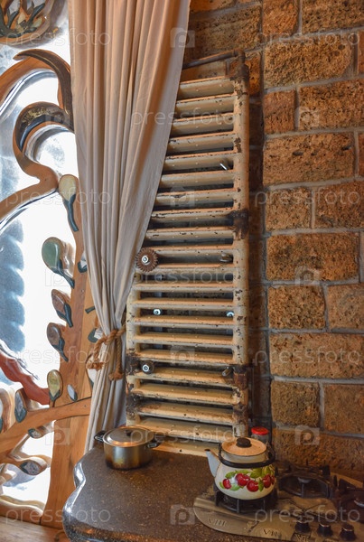 Старый вертикальный радиатор у окна с необычной рамой, рядом с печью из натурального камня, на которой стоит металлический чайник и кастрюля