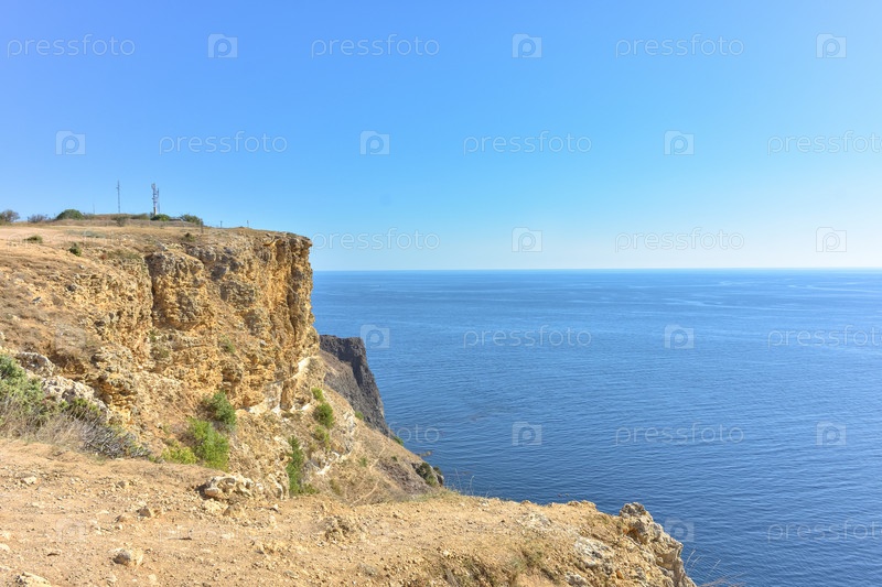 Мыс Фиолент. Прекрасные виды на побережье Черного моря на мысе Фиолент летом в ясную погоду. Вид с воздуха на красивое морское побережье с бирюзовой водой и скалами