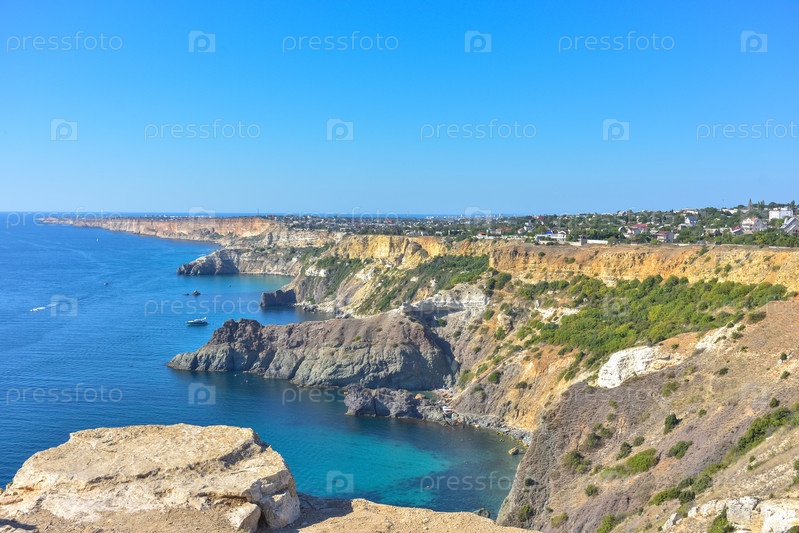 Мыс Фиолент. Прекрасные виды на побережье Черного моря на мысе Фиолент летом в ясную погоду. Вид с воздуха на красивое морское побережье с бирюзовой водой и скалами