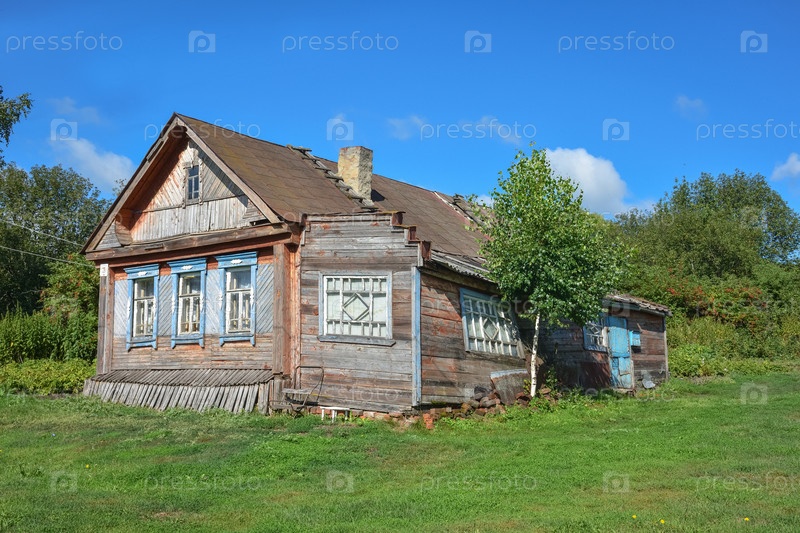 Деревянный дом в деревне на фоне неба в окружении зелени