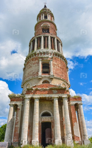 Заброшенная колокольня с крестом, из кирпича с колоннами на фоне неба, заросшая травой, крупный план, вид снизу, деревья