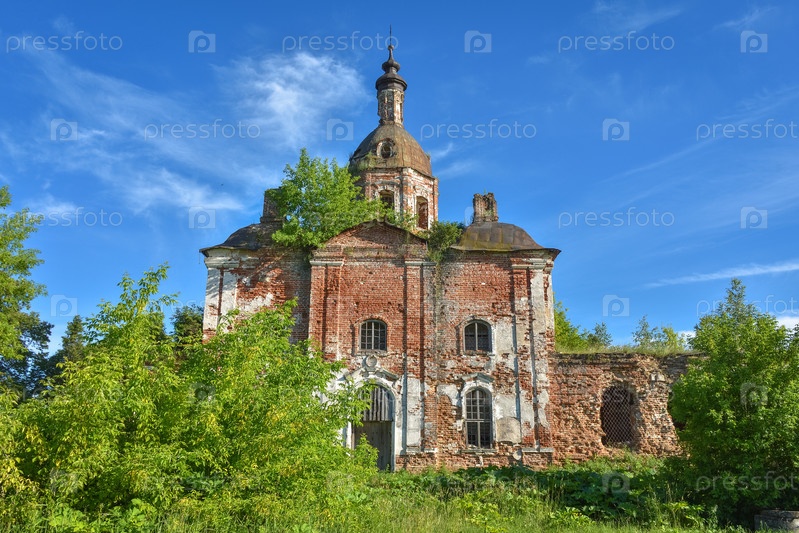 Заброшенная полуразрушенная церковь, заросшая травой на фоне неба, в окружении зелени