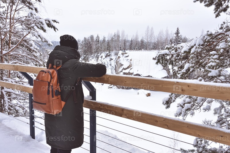 Девушка стоит на мосту и смотрит на зимний пейзаж