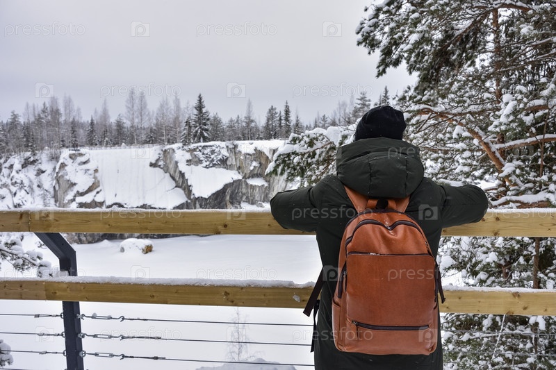 Девушка стоит на мосту и смотрит на зимний пейзаж