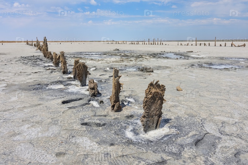 Потрясающая белая соляная пустыня или соляное озеро. остатки деревянного здания в соленом озере. высохшее соленое озеро, изъеденное солью здание, гнилое деревянное здание
