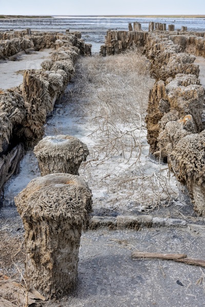 Потрясающая белая соляная пустыня или соляное озеро. остатки деревянного здания в соленом озере. высохшее соленое озеро, изъеденное солью здание, гнилое деревянное здание