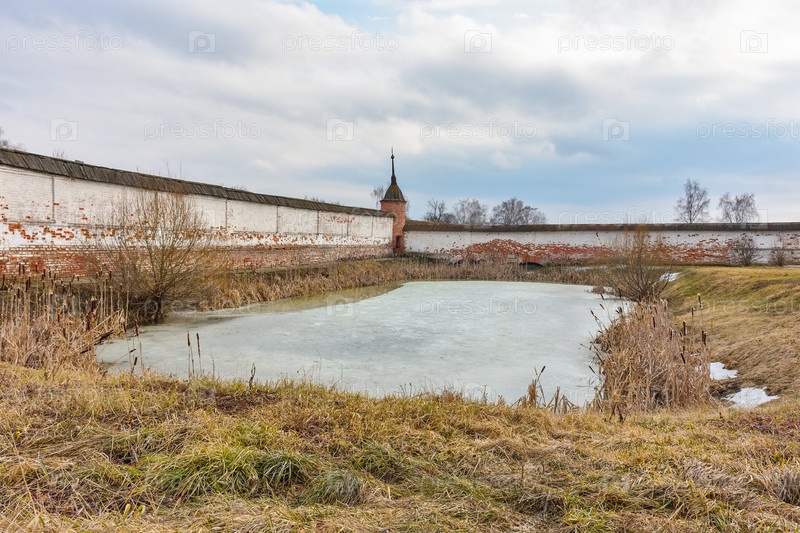 Юрьев-Польский / Россия - 7 марта 2020 г.: Стены и пруд в Михайло-Архангельском монастыре