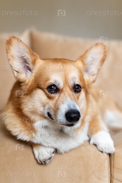 Портрет милой рыжей валлийской собаки Корги, лежащей дома на диване