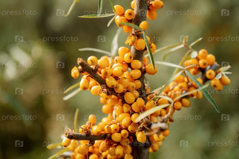 Ветка облепихи, покрытая гроздьями спелых оранжевых ягод