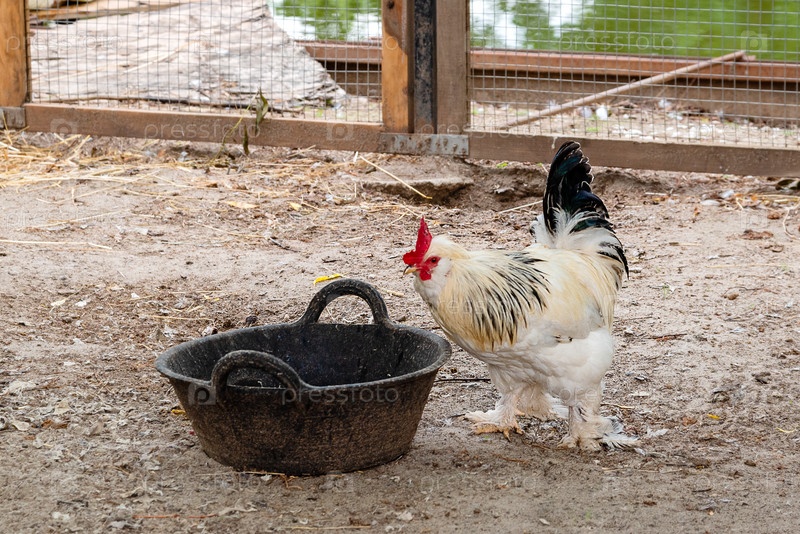 Петух клюет зерно из миски на ферме
