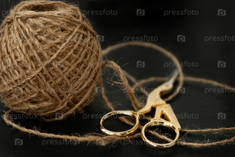 Грубый шпагат, скрученный в клубок, и ножницы на темной столешнице крупным планом