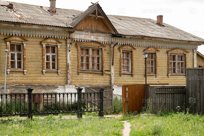 Старое выветрившееся деревянное здание с резными накладками на окнах