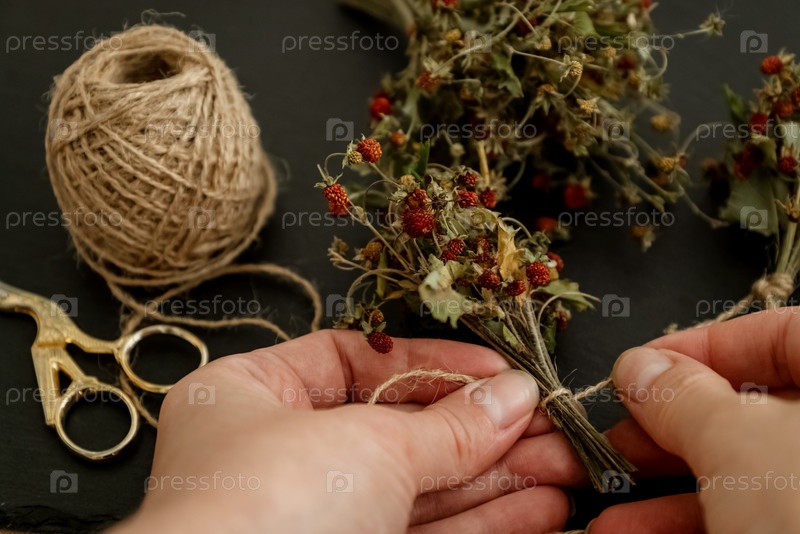 Женские руки связывают сухие веточки клубники с ягодами в небольшой пучок шпагатом