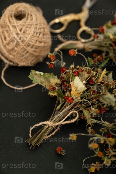 Куча сушеных веточек земляники с ягодами. Лекарство из трав