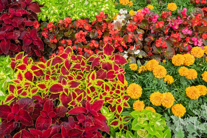 Ряды разных сортов ярких цветов на цветочной клумбе крупным планом