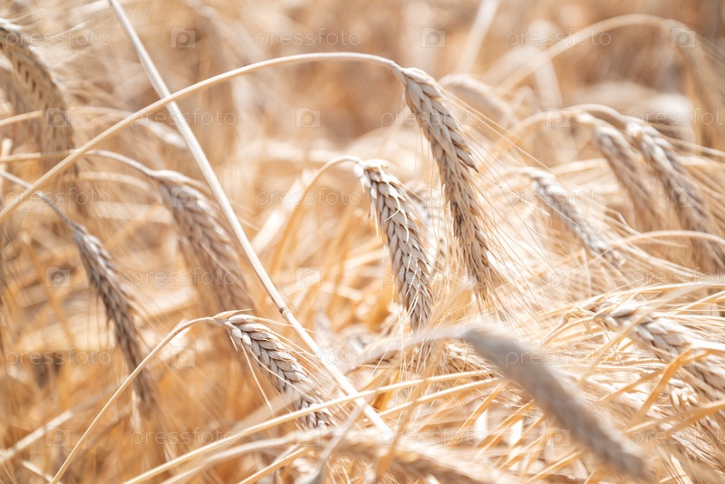 Поле ржи в летний день, крупный план спелых ржаных колосьев на солнце