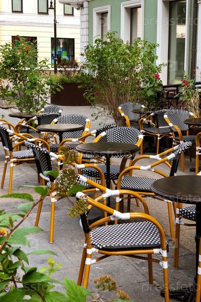 Интерьер летней веранды в уличном кафе с плетеной мебелью