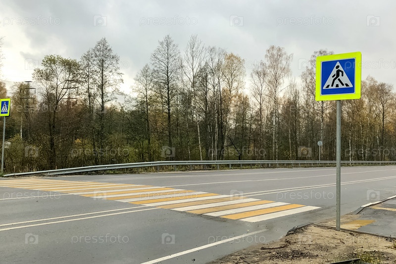 Желто-белая зебра и дорожный знак пешеходного перехода через дорогу