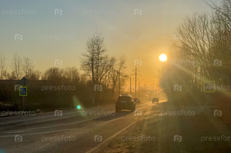 Автомобили едут по дороге на закате света городского пейзажа