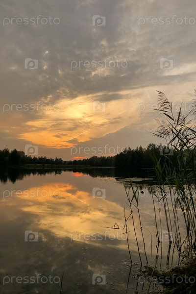 Силуэты тростниковой травы на берегу озера на фоне драматического закатного неба летний пейзаж
