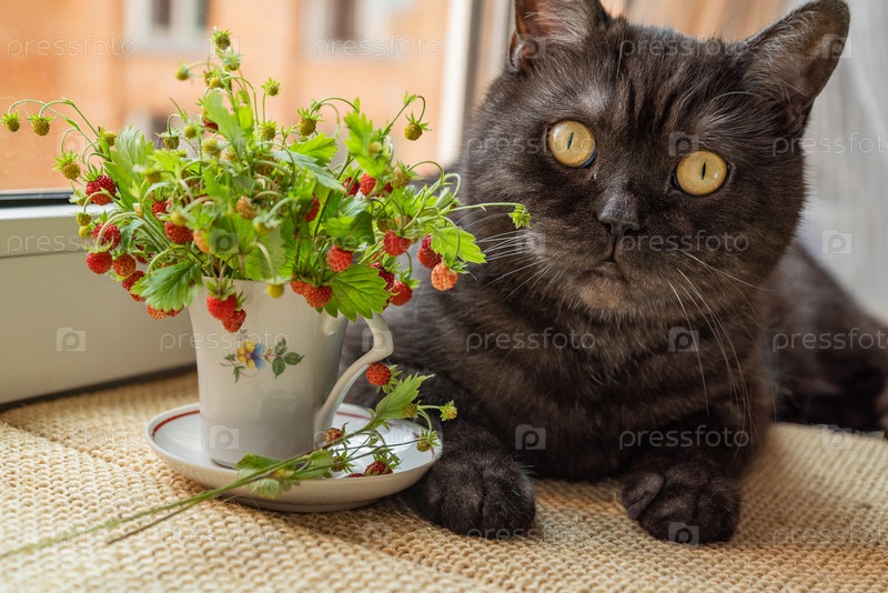 Милый кот с желтыми глазами нюхает ветку земляники с красными спелыми ягодами