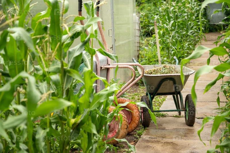 Тачка, полная травы, стоит на тропинке возле теплицы в огороде, работает в саду