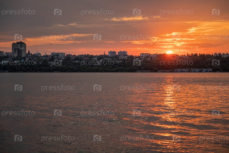 Оранжевый закат над рекой, силуэты городских зданий на горизонте