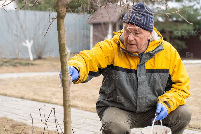 Ранняя весна, фермер покрывает дерево белой краской для защиты от грызунов, весенние садовые работы, побелка деревьев. Концепция садоводства и людей