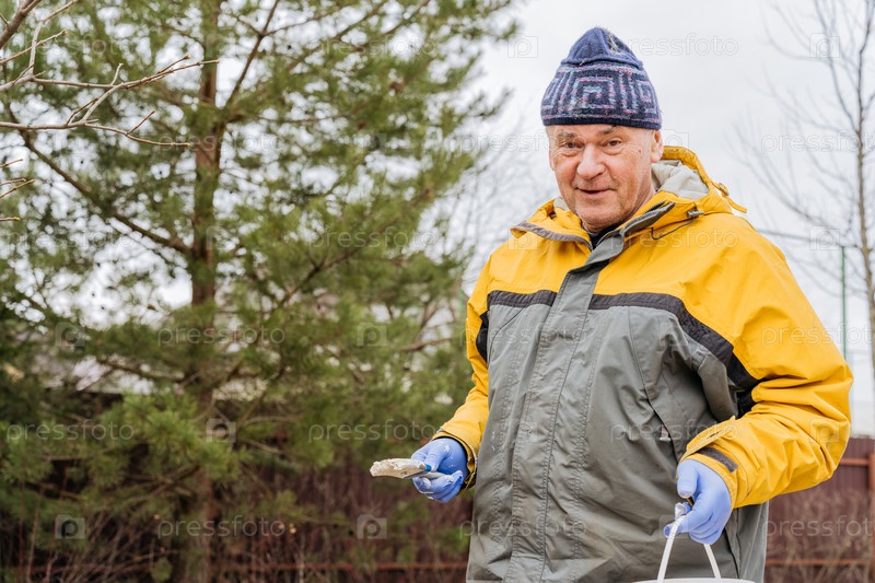 Улыбающийся пожилой мужчина в саду держит кисть и ведро с побелкой. Весенняя работа в саду, концепция садоводства