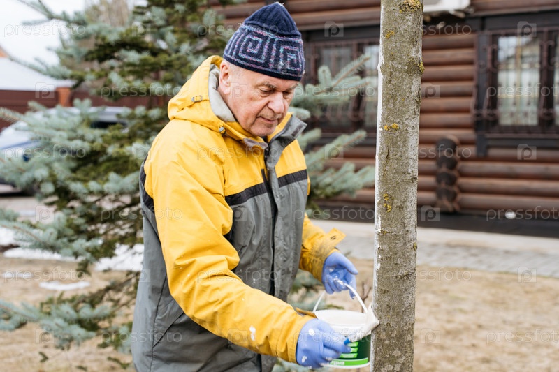 Ранняя весна, фермер покрывает дерево белой краской для защиты от грызунов, весенние садовые работы, побелка деревьев. Концепция садоводства и людей