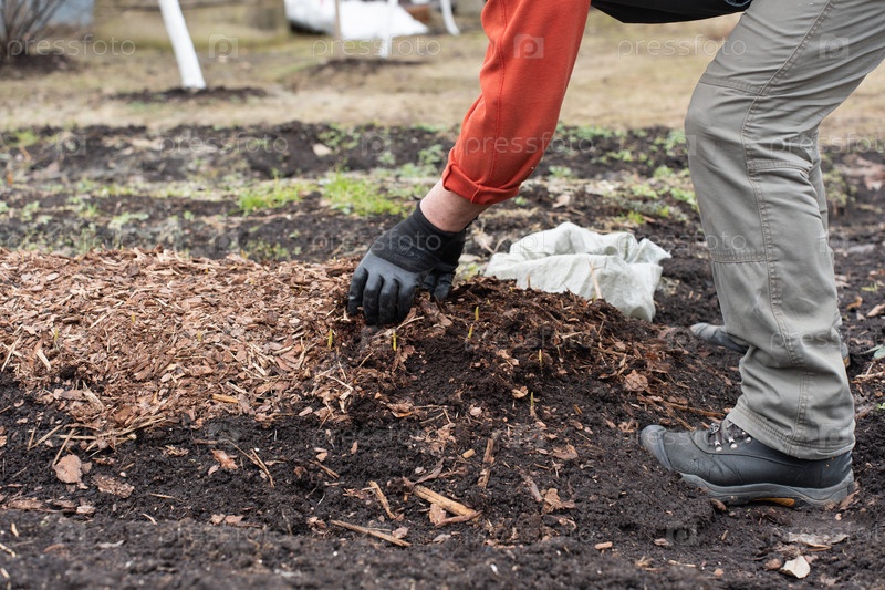 Мужчина в перчатках работает в саду. Руки в перчатках снимают опилки с грядки с небольшими ростками чеснока