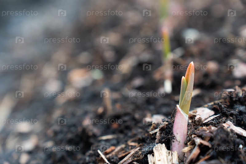 Закройте молодой росток чеснока в саду. Маленькое растение на куче почвы в саду