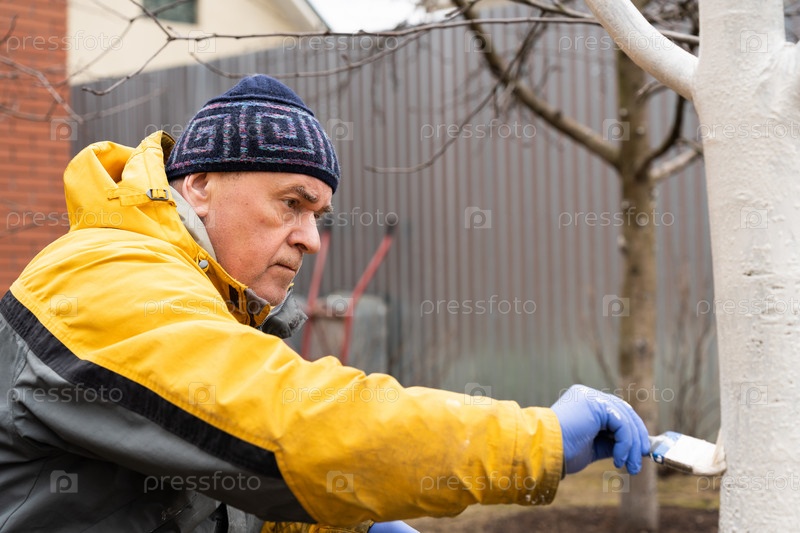 Ранняя весна, фермер покрывает дерево белой краской для защиты от грызунов, весенние садовые работы, побелка деревьев. Концепция садоводства и людей