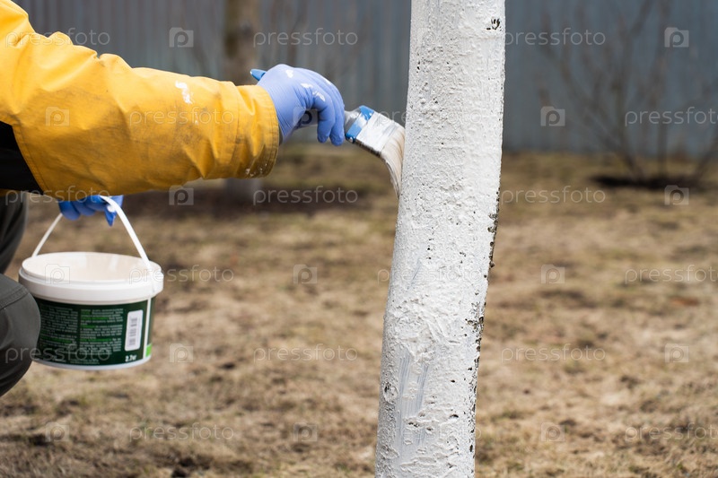 Весенняя работа в саду, концепция садоводства. Нанесение побелки на фруктовые деревья в саду. Человеческие руки в перчатках держат кисть и ведро с побелкой. Садовник красит ствол дерева кистью. Работа в саду. Ствол плодового дерева, защита от вредителей и