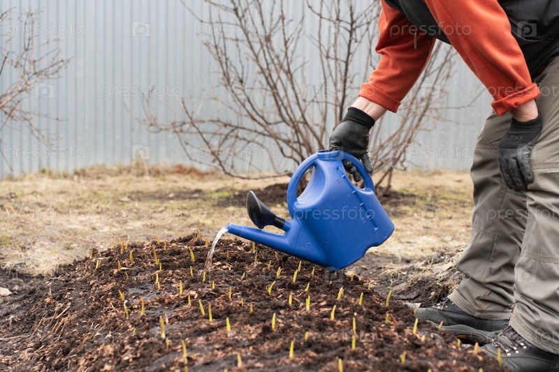 Мужчина-фермер поливает молодую рассаду на грядке. Мужчина в перчатках удобряет почву из лейки. Концепция сельского хозяйства и сельского хозяйства. Выращивание органических овощей на ферме
