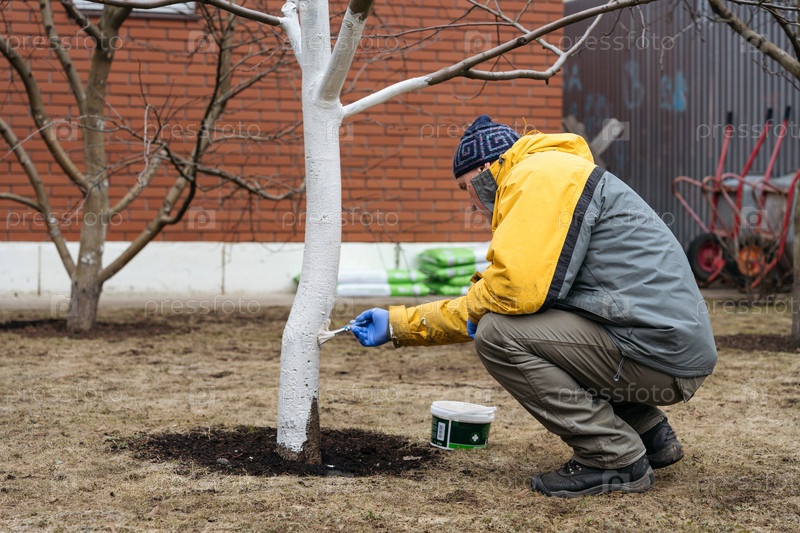 Ранняя весна, фермер покрывает дерево белой краской для защиты от грызунов, весенние садовые работы, побелка деревьев. Концепция садоводства и людей