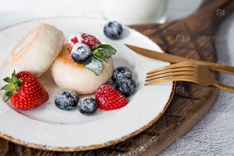 Блинчики с творогом, русские сырники со свежей черникой, клубникой и мятой на стильной деревянной доске на сером бетонном столе. Натуральные продукты. Здоровый и вкусный завтрак
