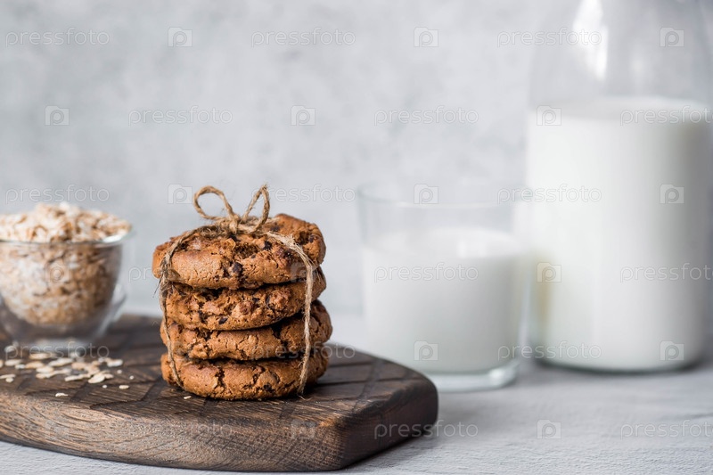 Органическое натуральное коровье молоко в стеклянной бутылке, овсянка и овсяное печенье на стильной деревянной доске на каменном столе. Натуральные экологически чистые продукты