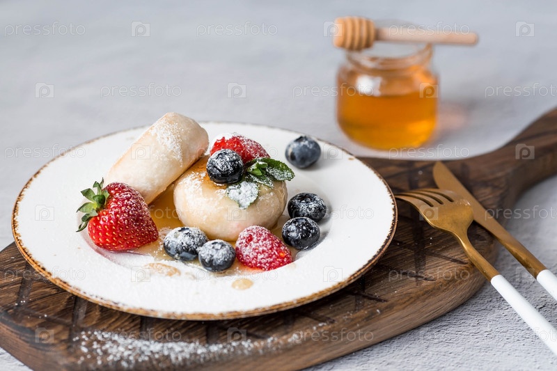 Блины с творогом, русские сырники со свежей черникой, клубникой, медом и листьями мяты на стильной деревянной доске на сером бетонном столе. Натуральные продукты. Здоровый и вкусный завтрак