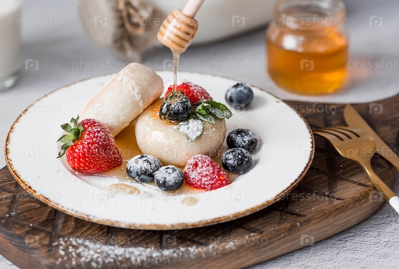 Блины с творогом, русские сырники со свежей черникой, клубникой, медом и листьями мяты на стильной деревянной доске на сером бетонном столе. Натуральные продукты. Здоровый и вкусный завтрак