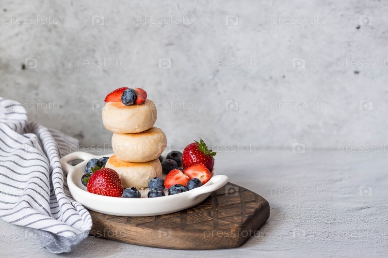 Блинчики с творогом, русские сырники со свежей черникой, клубникой и мятой на стильной деревянной доске на сером бетонном столе. Натуральные продукты. Здоровый и вкусный завтрак
