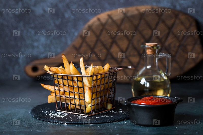 Картофель фри в металлической корзине с солью, кетчупом и подсолнечным маслом на стильной доске на темном фоне. Жареная картошка. Концепция фаст-фуда и нездоровой пищи
