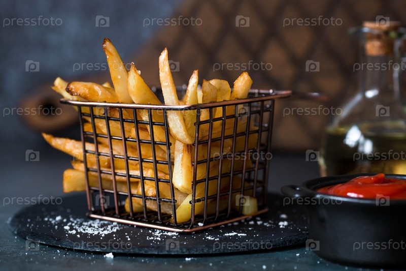 Картофель фри в металлической корзине с солью, кетчупом и подсолнечным маслом на стильной доске на темном фоне. Жареная картошка. Концепция фаст-фуда и нездоровой пищи