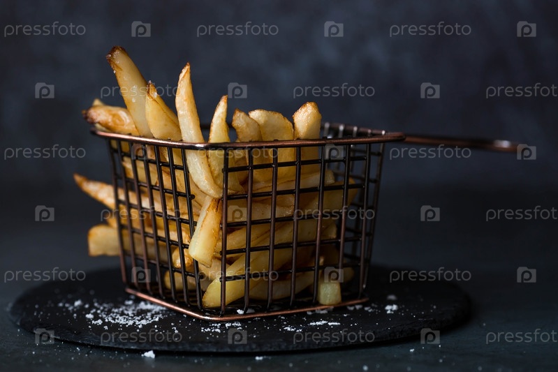 Картофель фри в металлической корзине с солью на стильной доске на темном фоне. Жареная картошка. Концепция фаст-фуда и нездоровой пищи