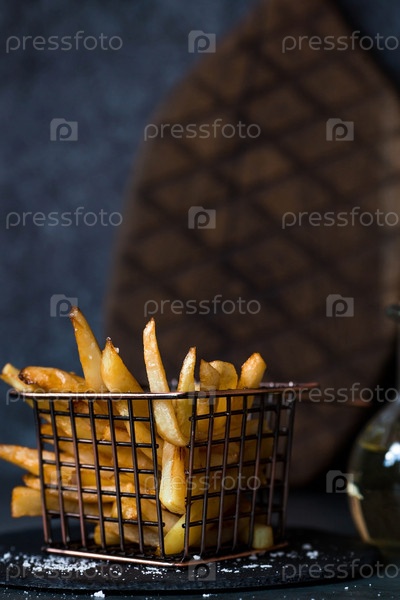 Картофель фри в металлической корзине с солью, кетчупом и подсолнечным маслом на стильной доске на темном фоне. Жареная картошка. Концепция фаст-фуда и нездоровой пищи