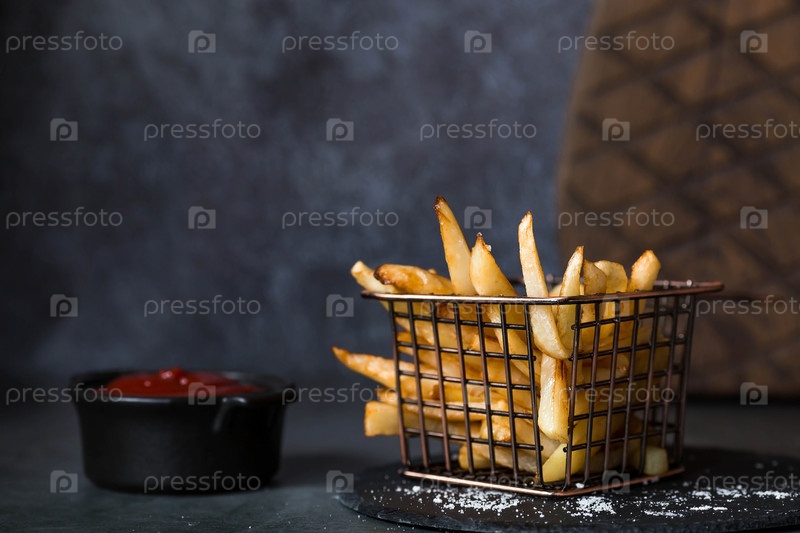 Картофель фри в металлической корзине с солью и кетчупом на стильной доске на темном фоне. Жареная картошка. Концепция фаст-фуда и нездоровой пищи