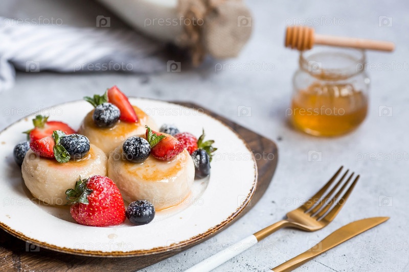 Блины с творогом, русские сырники со свежей черникой, клубникой, медом и листьями мяты на стильной деревянной доске на сером бетонном столе. Натуральные продукты. Здоровый и вкусный завтрак