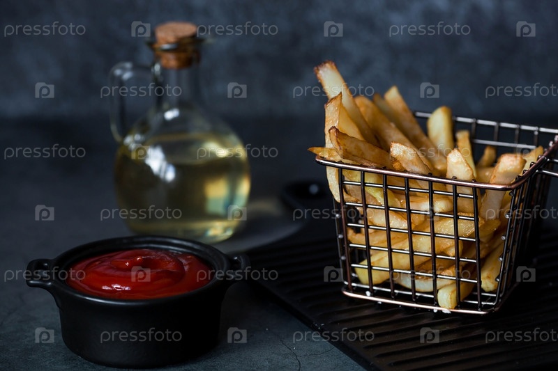 Картофель фри в металлической корзине с солью, кетчупом и подсолнечным маслом на стильной доске на темном фоне. Жареная картошка. Концепция фаст-фуда и нездоровой пищи