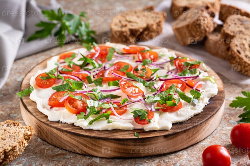 Домашняя масляная доска с помидорами, красным луком и зеленью и кусочками багета на столе